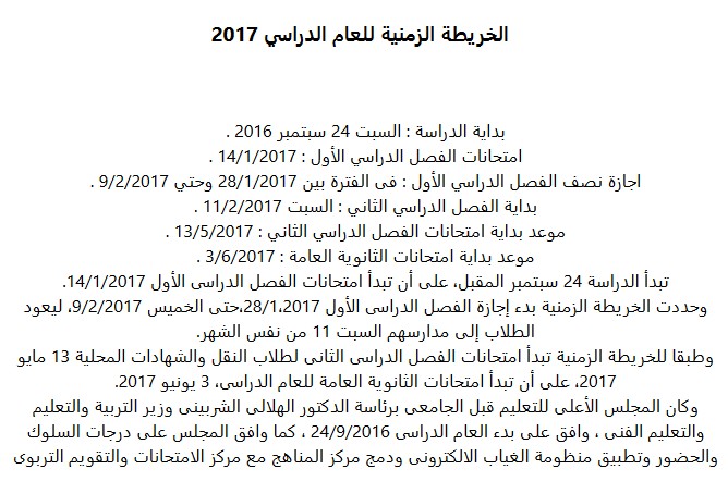 الخريطة الزمنية للعام الجديد 2017 شاملة الاجازات وبداية العام الدراسى وموعد الامتحانات