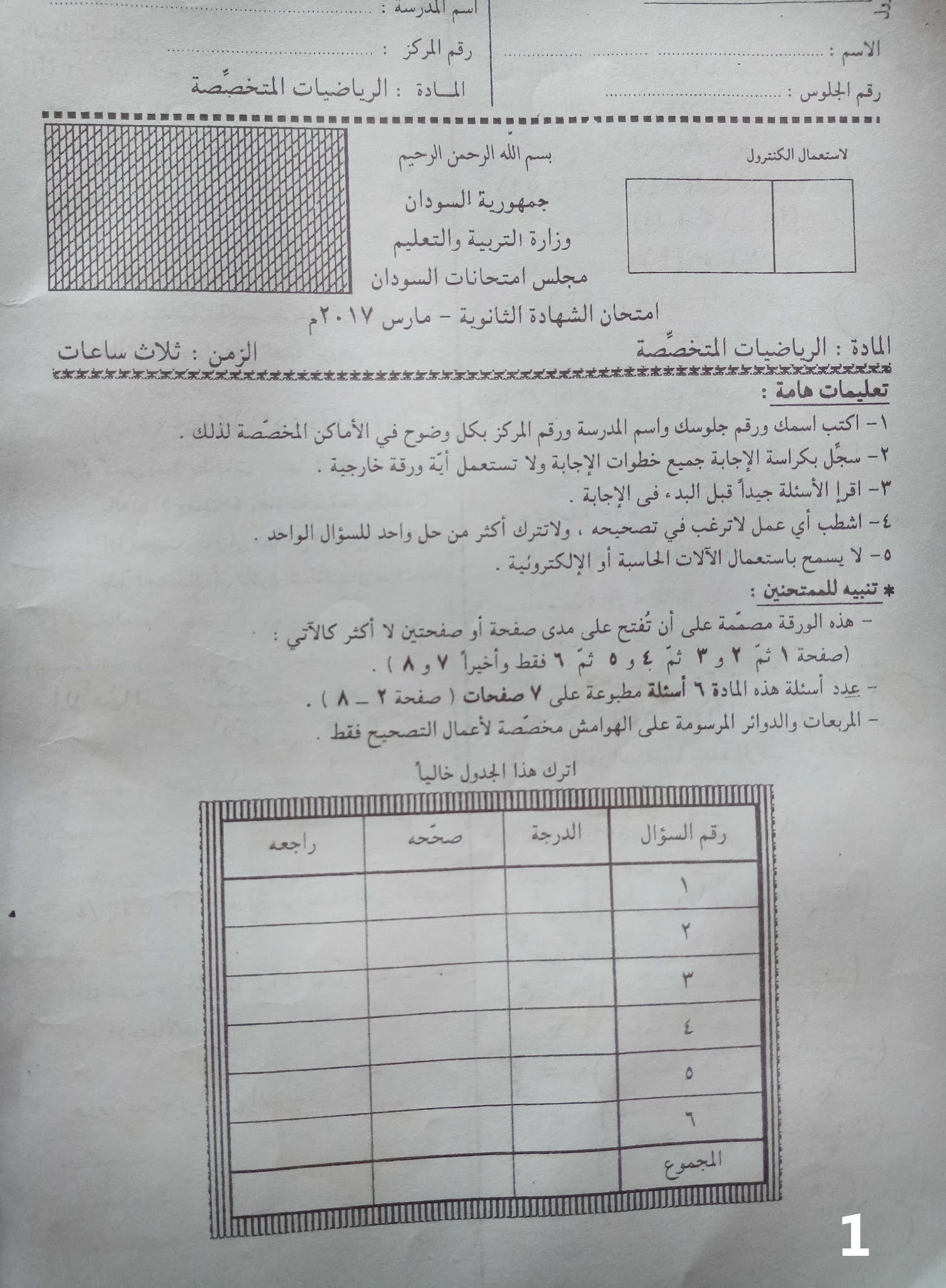 نموذج لامتحان الرياضيات المتخصصة وفق رياضيات الشهادة السودانية Facebook