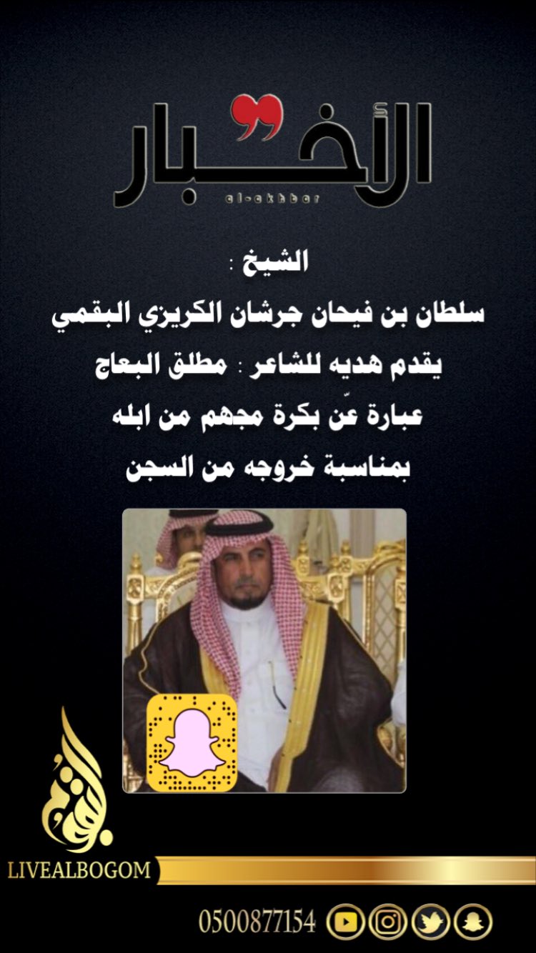لايف البقوم الرسمي On Twitter الشيخ سلطان فيحان بن جرشان الكريزي يقدم هديه للشاعر مطلق البعاج عبارة ع ن بكرة مجهم من ابله بمناسبة خروجه من السجن لايف البقوم Https T Co Vb6pvmt4kg