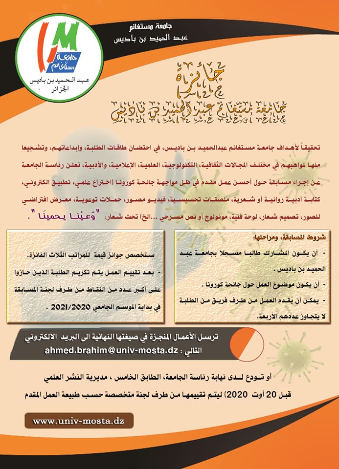 جـــامــعـــــــة عــبـد الحــمــيـــد بــن بــاديـــــــس مــســتــغــــــانــم sep 14 2020 l organisation de la coopération islamique met à la disposition de ses pays membres 12 bourses d études destinées aux étudiants au titre de l année 2020 2021. جامعة عبد الحميد بن باديس مستغانم بالفرنسية. جامعة عبد الحميد بن باديس مستغانم بالفرنسية.